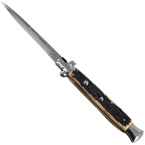 12.5″ Faux Stag Switchblade Stiletto Automatic Knife Satin Bayo. This menacing automatic stiletto knife features a near 6-inch stainless-steel blade with a mirror polish finish, as well as an impressive faux stag handle. To open the knife, you will press the shiny silver button at the top of the handle. To close, push the silver t-shaped bolster above the handle toward the base with your thumb. A slide lock on the handle prevents accidental opening while not in use. Included with this knife is a free black nylon quick release sheath with belt loop for easy carry. Overall Length: 12.50 Inches, Blade Length: 5.62 Inches