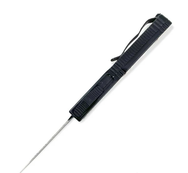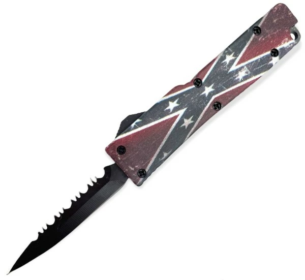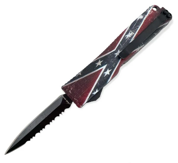 5″ Slim Confederate Flag D/A OTF Automatic Knife Black Dagger Serrated. Keychain/lanyard attachment loop Lifted traction ridges 5.125 inch overall length 440 stainless steel Amazing value Belt clip
