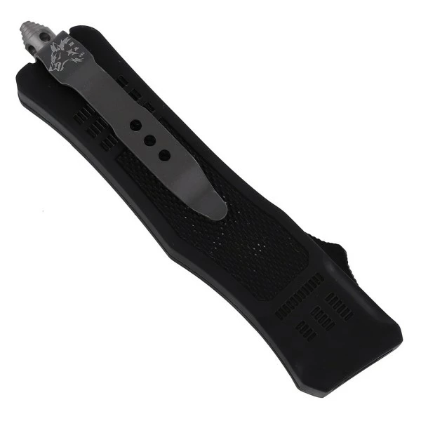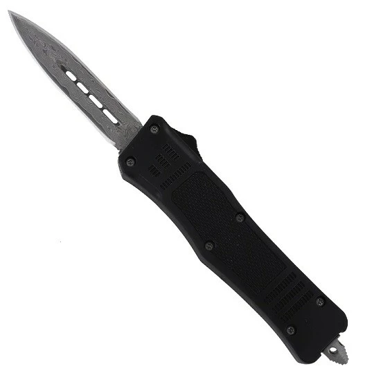 7″ Damascus Delta Force D/A OTF Black Automatic Knife Dagger. Your enemies’ luck has just run out. This automatic out the front knife is great because it is dual-action, meaning you can eject and retract your blade with only the push of a button. The Damascus steel blade is made into a wicked dagger point style and has a gorgeous wave pattern. The handle casing is made from a durable zinc aluminum alloy and comes with a textured diamond grip design. This feature is perfect for better grip, especially in wet conditions. This dual-action automatic knife also comes equipped with a gunmetal grey pocket clip and glass breaker in case of emergencies. Included with your knife is a nylon sheath with snap closure and belt loop so you can conveniently carry it anywhere. Overall Length: 7 inches, Blade Length: 2.75 inches