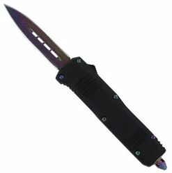 7″ Damascus Ranger D/A OTF Black Automatic Knife Rainbow Dagger. This knife has all of the power of a regular Out the Front knife, now in a miniature size! The blade is forged out of 1095/15N20 Damascus steel that has been folded over and over approximately 176-180 times to give it that beautiful and unique wave-like pattern. This steel has a Rockwell rating of 54-56. The blade is formed into a spear point style and has been heat treated to present a gorgeous titanium rainbow finish. The matte black handle casing is made from a durable zinc aluminum alloy. the blade of this dual-action automatic knife can be ejected and retracted using the switch located on the side of the handle. The handle also comes equipped with a rainbow titanium pocket clip and glass breaker in case of emergencies. Included with your knife is a black sheath with snap closure and belt loop so you can conveniently carry it anywhere. Overall Length: 7, Blade Length: 2.75 inches