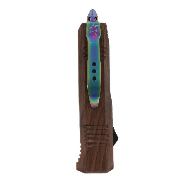 7″ Mini Ranger OTF Wood Automatic Knife Tanto Rainbow Damascus. The blade is made from Damascus steel and features a rippling wavelike finish. The wave pattern is enhanced by the rainbow finish. modified tanto style blade, faux wood grain finish, zinc alloy handle. Anodized rainbow hardware including the pocket clip and small glass breaker. quick release nylon sheath with belt loop. Overall Length: 7 inches, Blade Length: 2.75 inches