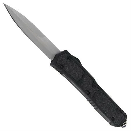 The handle has a zinc alloy casing with a sandpaper texture. The slider is located on the side to propel the blade forward and retract. steel pocket clip with a quick release nylon sheath. Overall Length: 8.5 Inches.