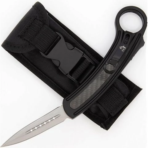 8.75″ Black Carbon Fiber Karambit D/A OTF Automatic Knife Dagger. Overall Length: 8.76 Inches Blade Length: 3.28 Inches Blade Width: 0.66 Inch Blade Thickness: 2.76 mm Blade Style: Dagger Point Blade Construction: Steel Handle Construction: Zinc Aluminum with Carbon Fiber Inlay Handle Length: 5.8 Inches Includes: Black Nylon Sheath Features: Karambit Style, Automatic Knife