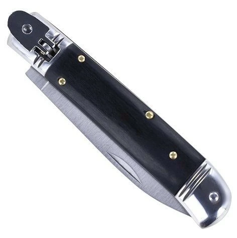 8 Inch Classic Black Wood Leverlock Automatic Knife Flat Grind Drop Point. Specifications Overall Length: 8 Inches Blade Length: 3.5 Inches Blade Width: 0.76 Inch Blade Thickness: 2.55 mm Handle Length: 4.46 Inches Blade Style: Spey Point Blade Construction: Stainless Steel Handle Construction: Wood Includes: Black Nylon Sheath Features: Black wood grips, Lever Lock