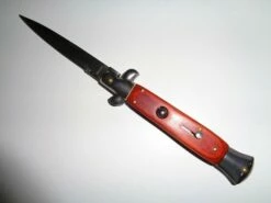 9.5″ Rosewood Switchblade Stiletto Automatic Knife. These knives make great gifts for any occasion. made with the word stiletto stamped into the blade. 9.5 Inches total length with a 4 inch 440 stainless steel blade.