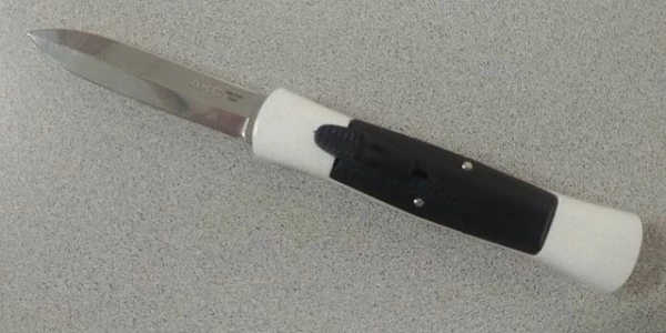 AKC 007 Concord White Black OTF Automatic Knife Satin Dagger. 2.75″ blade length 7 inches overall length. Made in Italy. Spring loaded, shoots in and out with the push of a button.