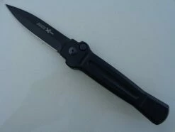 The AKC X-TREME made with modern materials and an aggressive italian design. This new automatic model “ACE” features a CNC worked 6061-T6 aircraft aluminium handle in black. The blade on this switchblade is made of AUS-8 japanese steel with a HRC of 58-59 and has a PVD coated finish. It includes a tip up clip for the belt. The “ACE” from AKC X-TREME is very nice and light EDC. Overall Length: 21.5cm – 8.5″ Blade Length: 9.5cm – 3.7″ Weight: 105gr – 3.7ozBlade Material: AUS-8 Japanese Steel Handle Material: Aluminium Made in: Taiwan