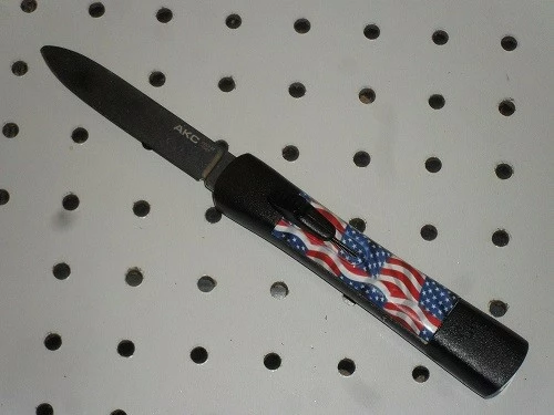 AKC Concord American Flag D/A OTF Automatic Knife Satin Flat Grind. If your looking for an otf knife with great spring action and all hand made, this is the knife for you. It is made by AKC in Italy stamped concord on the handle. 3″ black flat grind blade, 8″ overall length. These make great gifts and is something to add to any great collection of automatic knives.