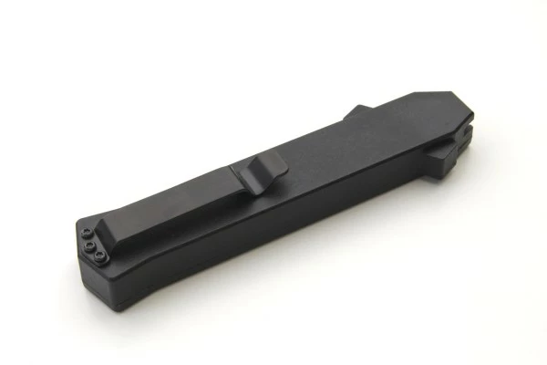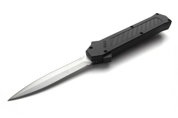 AKC F-16 Black Carbon Grip D/A OTF Automatic Knife Satin Dagger. Overall Length: 20cm – 8″ Blade Length: 8.5cm – 3.35″ Blade thickness: 3mm – 0.12″ Weight: 88 g – 3.10 oz. Blade Material: 440A Stainless steel Handle Material: Aluminium Black Carbon Inlay Material: Carbon Grip black
