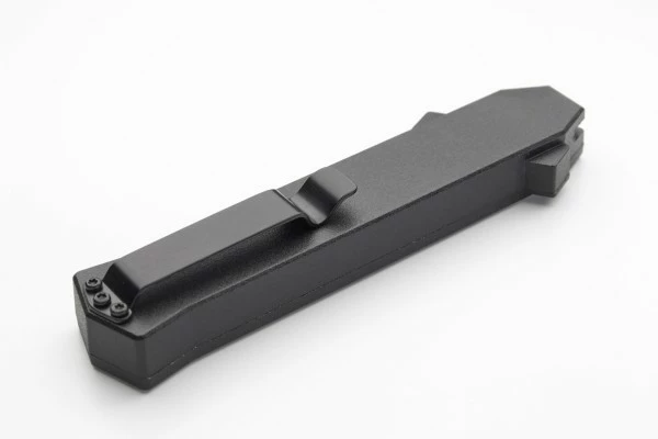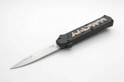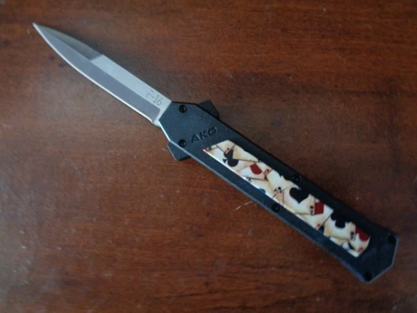 The 2017’s news of AKC OTF is called “F16″, like the Fighting Falcon supersonic fighter aircraft of United States Air Force. This is an awesome knife, strong and solid mechanism with it’s double springs inside for a durable and faster opening. Blade play is almost zero minimum blade play. Press the button forward and the blade rockets out. Pull the firing button back and the blade retracts safely. The action is fast and the knife is light and ergonomic. The aluminium handle has a customizable insert plaquette. Satin razon sharp bayonet blade, black pocket clip. Overall Length: 20cm – 8″ Blade Length: 8.5cm – 3.35″ Blade thickness: 3mm – 0.12” Weight: 88 g – 3.10 oz. Blade Material: 440A Stainless steel Handle Material: Aluminium Inlay Material: Poker cards