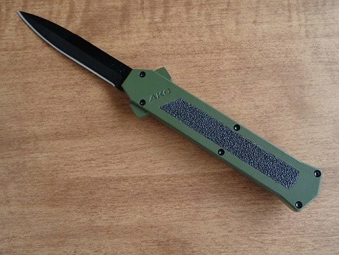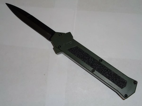 AKC F16 Military Green Out The Front Automatic Knife Black Bayo. Overall Length: 20cm – 8″ Blade Length: 8.5cm – 3.35″ Blade thickness: 3mm – 0.12″ Weight: 88 g – 3.10 oz. Blade Material: 440A Stainless steel Handle Material: Aluminium Military Inlay Material: Grip black
