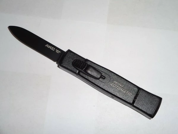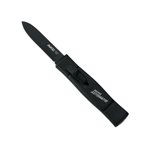 AKC Mini Black OTF Automatic Knife Black Flat Grind. Overall Length: 15cm – 5,75″ Blade Length: 6cm – 2,75″ Blade thickness: 1,9mm – 0.07″ Weight: 48 gr Blade Material: AISI 420 Stainless steel Handle Material: Alluminium Inlay Material: Aluminium Made in: Italy