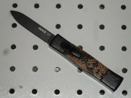 AKC Mini Concord Snakeskin Brown OTF Automatic Knife – Black/Flat Grind. If your looking for an otf knife with great spring action and all hand made, this is the knife for you. It is made by AKC in Italy stamped concord on the handle. 2.75″ black serrated blade, 5.75″ overall length. These make great gifts and is something to add to any great collection of automatic knives.
