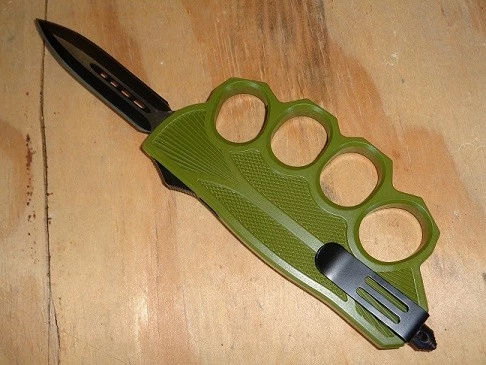 Biker USA Green D/A OTF Trench Automatic Knuckle Knife Black Drop Point. Overall Length: 9 Inches Blade Length: 3.5 Inches Blade Material: 440 Stainless Steel, Powder coated black finish Blade Style: Dagger Handle Length: 6 Inches Handle Material: Cast metal, Heavy duty construction Includes: Pocket Clip, Glass breaker, belt sheath.