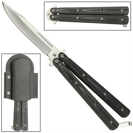 Sporting a silver clip point blade, the slim build and good weight of this balisong butterfly knife delivers nice action in an attractive package. The distinctive Micarta construction handle is decorated with an attractive black and grey wooden pattern which is attached to the steel inner framing with torque screw. A metal safety latch is included to lock the blade into place when it is not in use as well as when it is deployed. The blade offers blood grooves on both sides allowing for a more balance blade. This Black Micarta handle knife comes complete with a durable hard cover sheath which clips onto your belt or can be fastened through your belt. Overall Length: 9 Inches