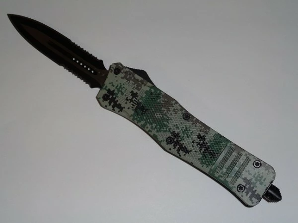 Delta Force Digi Camo D/A OTF Automatic Knife Dagger Double Serrated. This knife deploys lighting fast in and out with the push of the button. Included is a quick release nylon sheath Overall Length: 9.25 Inches.