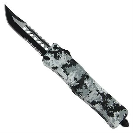 Delta Force OTF Winter Camo Automatic Knife Black Drop Point Serrated. pommel features a glass breaker. The handle is solidly built and held together with 6 hex screws. it is made from zinc and textured. There is also a pocket clip and a quick release tactical sheath. Overall Length: 9.25 Inches.