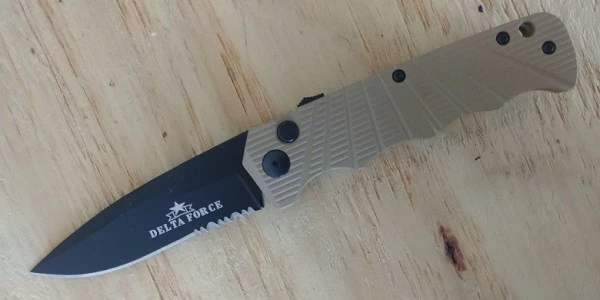 Delta Force Tan Side Opening Automatic Knife Black Drop Serrated. 3.5″ bayonet blade 7.75 inches overall length with a pocket clip and safety switch. Heavy construction all metal handle.