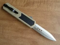 Firecracker 5″ Carbon Fiber D/A OTF Automatic Knife Black Dagger. The handle length is 3.125 inches while the overall length of the knife is 5.125 inches. The weight is 1 ounce and the handle width is 9 millimeters wide while the blade width is 2 millimeters. Keychain lanyard attachment loop Lifted traction ridges 5.125 inch overall length 2 inch 440 stainless steel dagger blade Belt clip