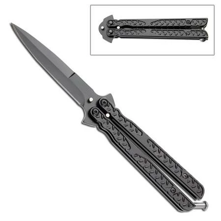 Gear Head Black Spear Point Butterfly Knife. Overall Length: 7.25 Inches Blade Length: 3.25 Inches Blade Material: Stainless Steel Blade Style: Dagger Point, Powder coated black Blade Thickness: 2.75 mm Handle Material: 4.75 Inches, Stainless Steel Includes: Pocket clip, Heavy Duty Construction