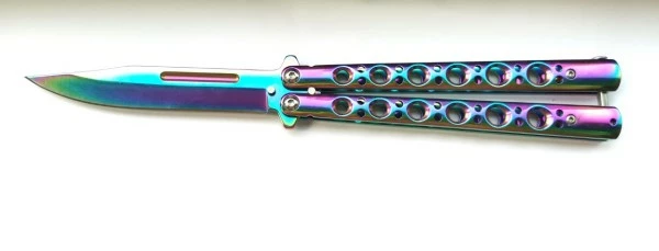 Heavy Duty 9″ Balisong Rainbow Butterfly Knife. Great knife for butterfly knife flipping tricks. 9 inch total length 3.5″ blade 440 stainless steel blade.