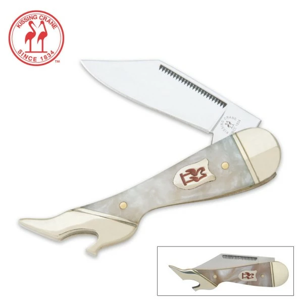 Kissing Crane Leg Genuine Pearl Folding Pocket Knife. Kissing Crane’s leg knives bring you the classic looks you want, with the elegant look of pearl composite handle scales. This folder not only looks great but also provides excellent grip and finish. 2 1/2″ blade. 3 1/8″ closed. Kissing Crane
