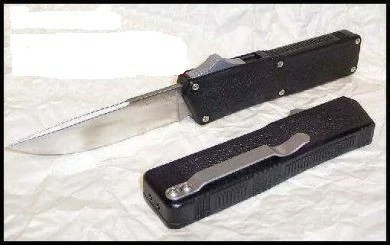 Lightning black DA otf automatic knife plain blade. 8 inch total length 3.25 inch blade. This knife has a super snap to it quick as lightning! It is a double action in and out switchblade knife. These are the taiwan versions. They are hot sellers and will go very quickly so get yours now while we still have them in stock.