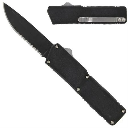 This particular style Lightening OTF knife features a black powered coated aluminum handle with a rough texture finish. The aluminum silver button to open and close this awesome Lightening knife is mounted on the spine of the handle. The extremely sharp blade offers you a black coating finish stainless steel with a partially serrated edge and with a marking of “”LIGHTNING” written on it. This knife comes equipped with a solid stainless steel belt and pocket clip. Overall 8 Inches, Blade length: 3.5 inches.