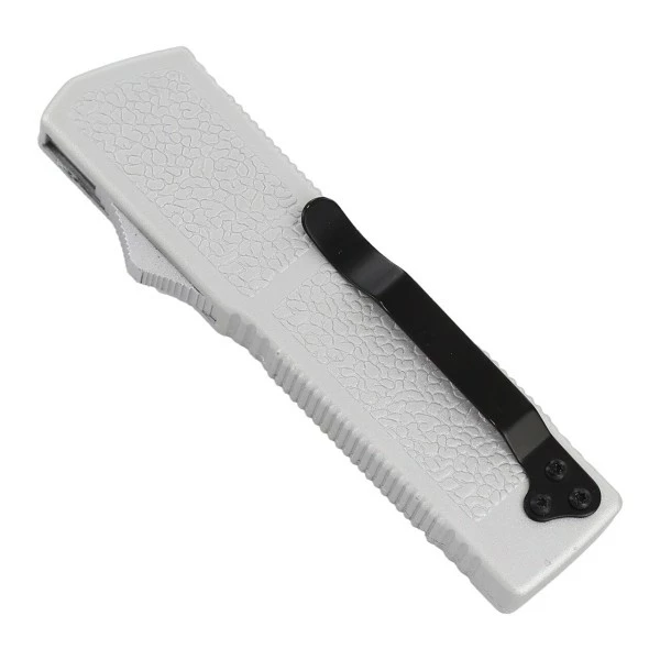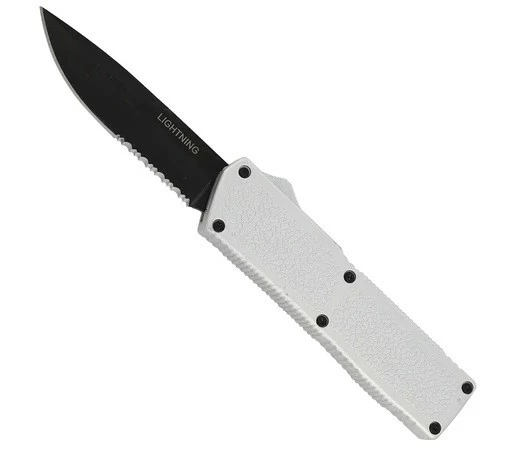Lightning Model 3 Silver D/A OTF Automatic Knife Black Drop Point Serrated. Features: Heavy Duty Automatic Dual Action Out the Front Blade Material: Stainless Steel Drop Point Style Partial Serration Anodized Black Finish Handle Material: Zinc Alloy; Silver Textured Grip Black Pocket Clip/Hardware Firing Button Specifications: Overall Length: 7.85 Inches Blade Length: 3.25 Inches Handle Length: 4.55 Inches