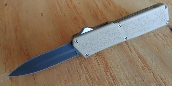 Lightning Tan D/A OTF Automatic Knife Black Dagger. 440 stainless steel 3.25 inch blade with a pocket clip on the side of the handle. 8 inches overall length with strong spring action. This knife is made in taiwan.