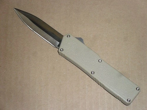 Lightning Tan Otf D/A Satin Double Edge Automatic Knife. 440 stainless steel 3.25″ blade with a pocket clip on the side of the handle. 8″ overall length. Strong spring action with a push of the button you can hear the blade snap into position. These are great switchblade knives for the money. This knife is made in taiwan.