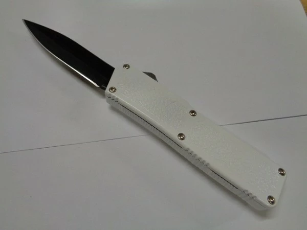Lightning White D/A OTF Automatic Knife Black Dagger. 440 stainless steel 3.25 inch blade with a pocket clip on the side of the handle. 8 inches overall length with super spring action on these knives. If you dont have one for your knife collection you should get one while you still can. This knife is made in taiwan.