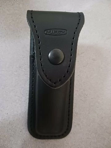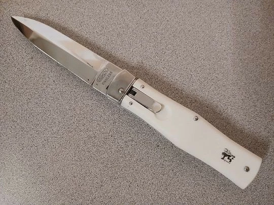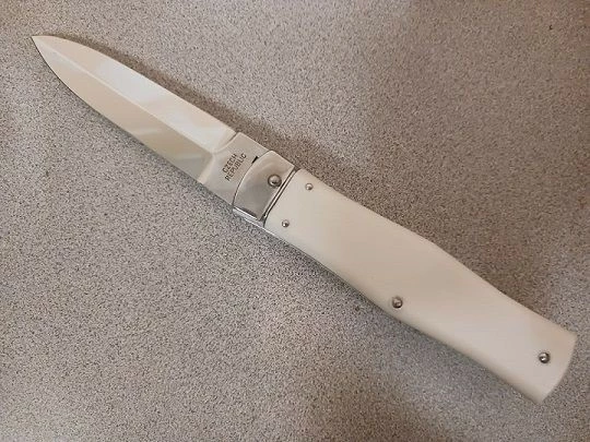 Mikov 241 Predator Leverlock Automatic Knife White No Clip. This knife has a very smooth action and nice weight when opening. This is for sure something you want in your collection of automatic knives. These are very well made and hard to come by. It is 8.5 inches overall length 3.75 inch dagger blade. No clip on the handle and comes with a leather belt sheath