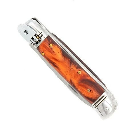 Orange Pearl Automatic Leverlock Knife Stainless. faux marble ABS grips, comes with its own black nylon sheath with a belt loop. Overall Length: 8 inches (Open), 4.5 inches (Closed). Weight: 0.4 lbs