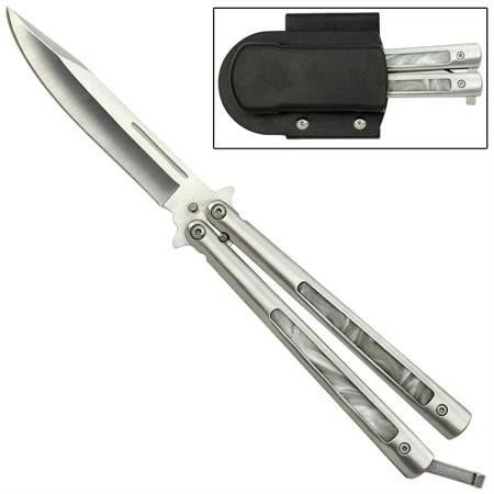 Sporting a stainless steel 3.875 inch spear point blade that has razor sharp edge with a silver finish, this premium balisong butterfly knife is ready for action! A Pearl Marble insert can be found imbedded within the silver handle frame. The stainless steel handle also features a silver finish and is very light in weight but at the same time extremely durable. A metal safety latch is included to lock the blade into place when it is not in use as well as when it is deployed. This Pearl Marble butterfly knife comes complete with a durable hard cover ABS sheath with a belt clip and it also offers a belt loop on it. Overall Length: 8.625 Inches
