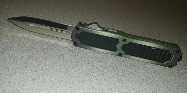 Titan Camo Carbon Fiber D/A OTF Automatic Knife Satin Dagger. comes with a pocket clip, glass breaker on the end of the handle and carbon fiber inserts. On the spine there is a push button for the OTF blade action. Very sturdy knife with great spring action and a hard snap to it. The overall length is 8.5″ with a silver double sided blade length of 3.25″.